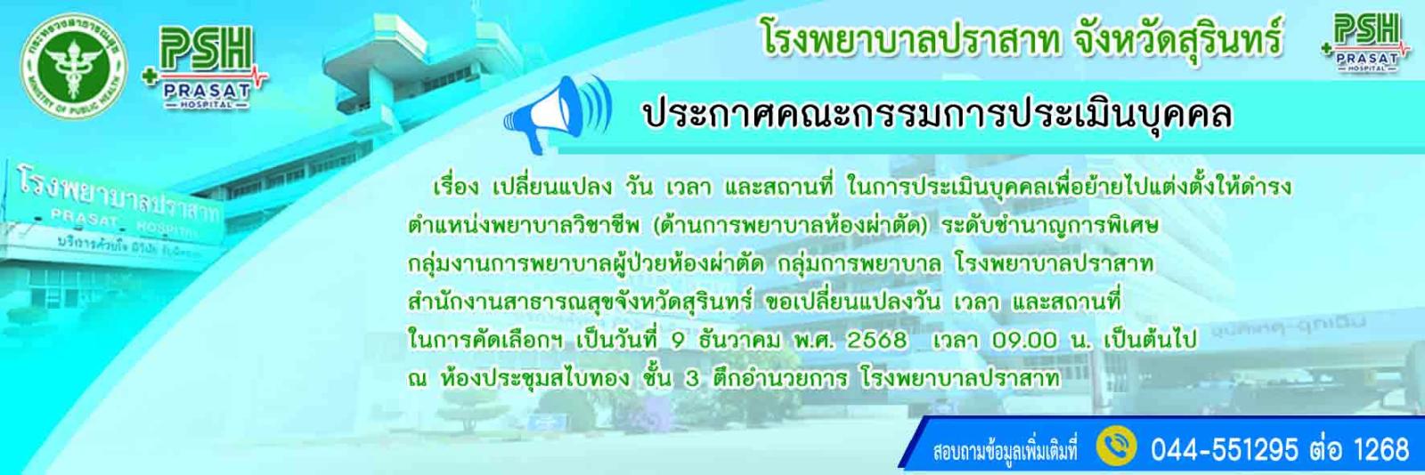 เรื่อง เปลี่ยนแปลง วัน เวลา และสถานที่ ในการประเมินบุคคลเพื่อย้ายไปแต่งตั้งให้ดำรง ตำแหน่งพยาบาลวิชาชีพ (ด้านการพยาบาลห้องผ่าตัด) ระดับชำนาญการพิเศษ กลุ่มงานการพยาบาลผู้ป่วยห้องผ่าตัด กลุ่มการพยาบาล โรงพยาบาลปราสาท สำนักงานสาธารณสุขจังหวัดสุรินทร์ ขอเปลี่