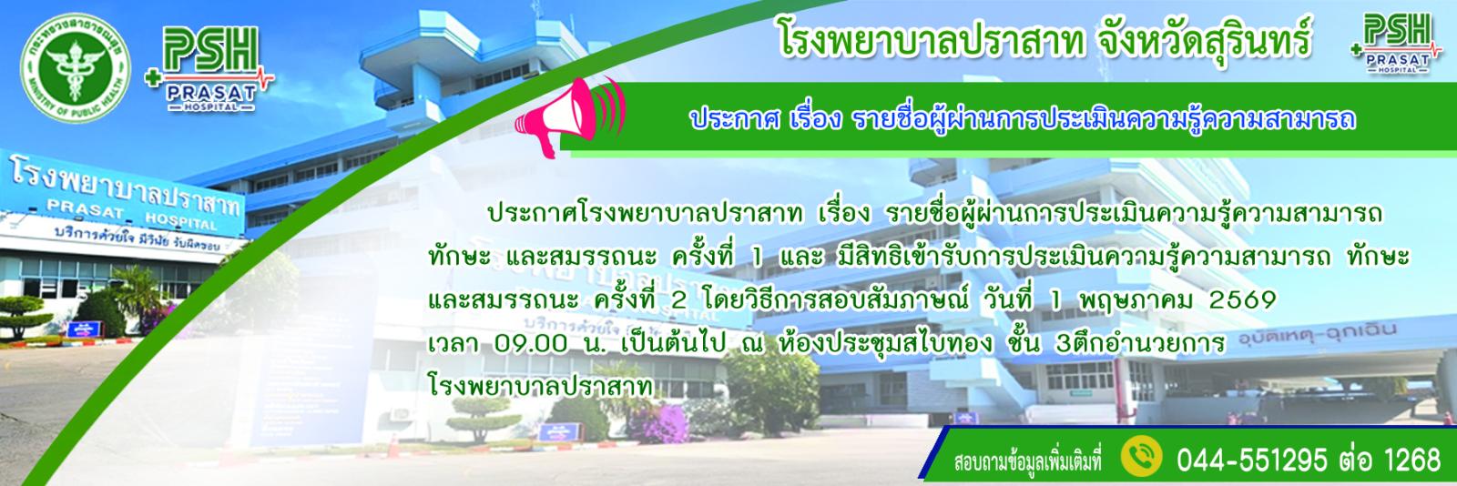 ประกาศโรงพยาบาลปราสาท เรื่อง รับสมัครบุคคลเพื่อเลือกสรรเป็นลูกจ้างชั่วคราว (รายวัน) 4 ตำแหน่ง 5 อัตรา
