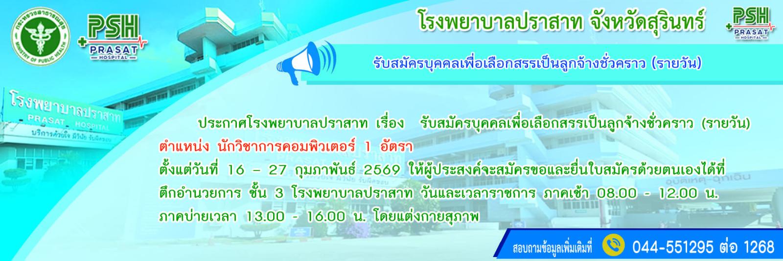 ประกาศโรงพยาบาลปราสาทเรื่อง รับสมัครบุคคลเพื่อเลือกสรรเป็นลูกจ้างชั่วคราว (รายวัน) ตำแหน่ง นักวิชาการคอมพิวเตอร์