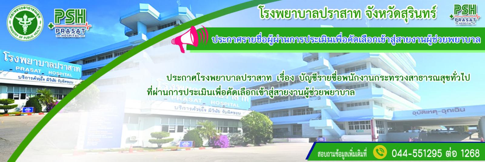 ประกาศโรงพยาบาลปราสาท เรื่อง บัญชีรายชื่อพนักงานกระทรวงสาธารณสุขทั่วไป ที่ผ่านการประเมินเพื่อคัดเลือกเข้าสู่สายงานผู้ช่วยพยาบาล
