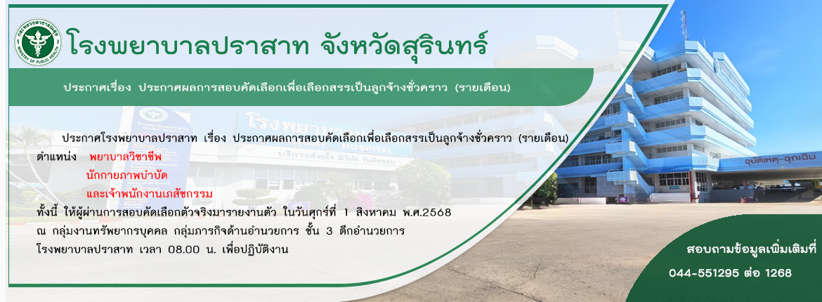 ประกาศผลการสอบคัดเลือกเพื่อเลือกสรรเป็นลูกจ้างชั่วคราว (รายเดือน) ตำแหน่ง พยาบาลวิชาชีพ นักกายภาพบำบัด และเจ้าพนักงานเภสัชกรรม