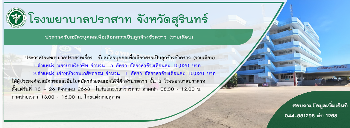 ประกาศโรงพยาบาลปราสาท เรื่อง รับสมัครบุคคลเพื่อเลือกสรรเป็นลูกจ้างชั่วคราว (รายเดือน) ตำแหน่ง พยาบาลวิชาชีพ และ ตำแหน่งเจ้าพนักงานเภสัชกรรม