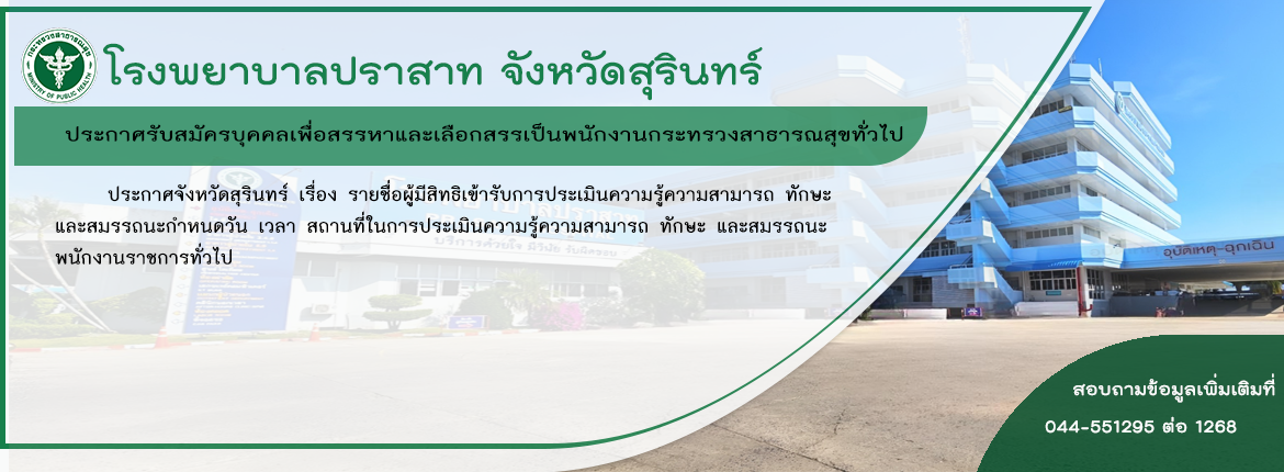 ประกาศจังหวัดสุรินทร์ เรื่อง รายชื่อผู้มีสิทธิเข้ารับการประเมินความรู้ความสามารถ ทักษะ และสมรรถนะ กำหนดวัน เวลา สถานที่ในการประเมินความรู้ความสามารถ