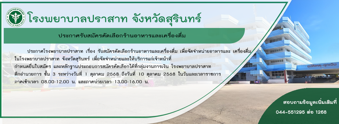 ประกาศโรงพยาบาลปราสาท เรื่อง รับสมัครร้านอาหารและเครื่องดื่ม เพื่อจัดจำหน่ายอาหารและเครื่องดื่ม ในโรงพยาบาลปราสาท
