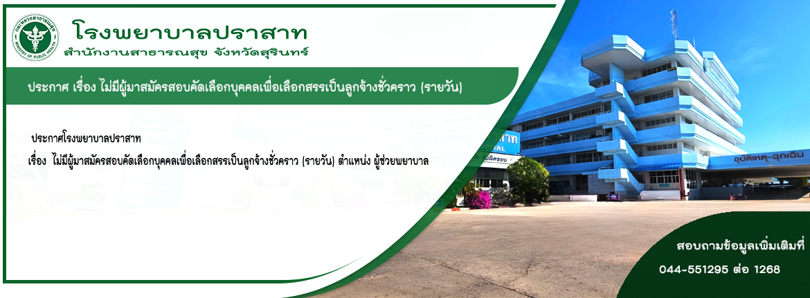 ประกาศโรงพยาบาลปราสาท เรื่อง ไม่มีผู้มาสมัครสอบคัดเลือกบุคคลเพื่อเลือกสรรเป็นลูกจ้างชั่วคราว (รายวัน) ตำแหน่ง ผู้ช่วยพยาบาล