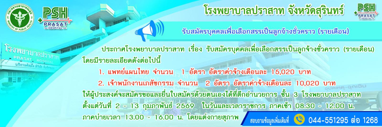 ประกาศโรงพยาบาลปราสาท เรื่อง รับสมัครบุคคลเพื่อเลือกสรรเป็นลูกจ้างชั่วคราว (รายเดือน)