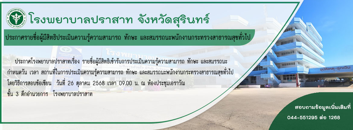 - ประกาศโรงพยาบาลปราสาทเรื่อง รายชื่อผู้มีสิทธิเข้ารับการประเมินความรู้ความสามารถ ทักษะ และสมรรถนะ กำหนดวัน เวลา สถานที่ในการประเมินความรู้ความสามารถ ทักษะ และสมรรถนะพนักงานกระทรวงสาธารณสุขทั่วไป โดยวิธีการสอบข้อเขียน วันที่ 26 ตุลาคม 2568 เวลา 09.00 น.