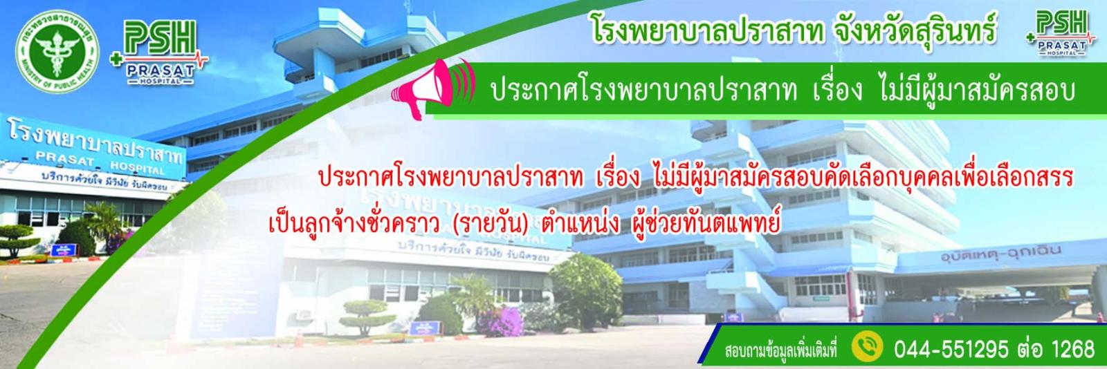 ประกาศโรงพยาบาลปราสาท เรื่อง ไม่มีผู้มาสมัครสอบคัดเลือกบุคคลเพื่อเลือกสรรเป็นลูกจ้างชั่วคราว (รายวัน) ตำแหน่ง ผู้ช่วยทันตแพทย์
